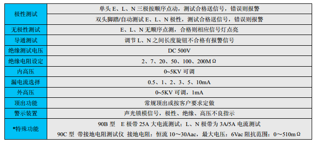 适用范围 Scope: 本机适用于对二芯、三芯及单头、双头电源插头线的导通极性、绝缘电阻、漏电、线间高压(内高压)、