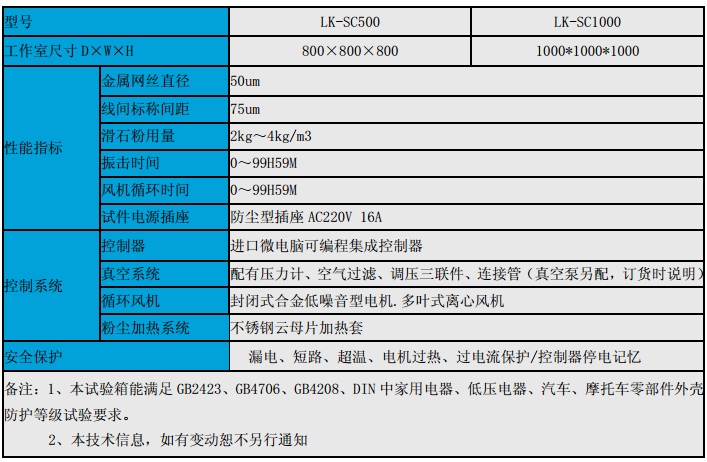另注:本试验箱能满足GB2423、GB4706、GB4208、DIN中家用电器、低压电器、汽车、摩托车零部件外壳防护等