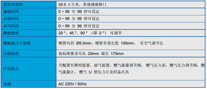 有关条款设计制造,对设备和器具的塑料部件进行水平、垂直可燃性试验,并配置有气体流量计,调节火焰大小,采用电机驱动