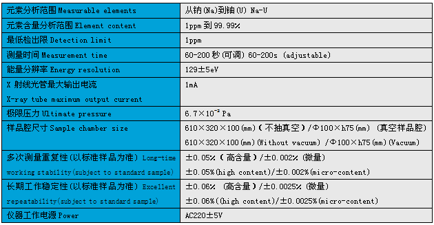 的检出限,标准检出限较SI-PIN探测器提高100倍;测量范围更宽,基本涵盖了各种常规材料元素分析要求;